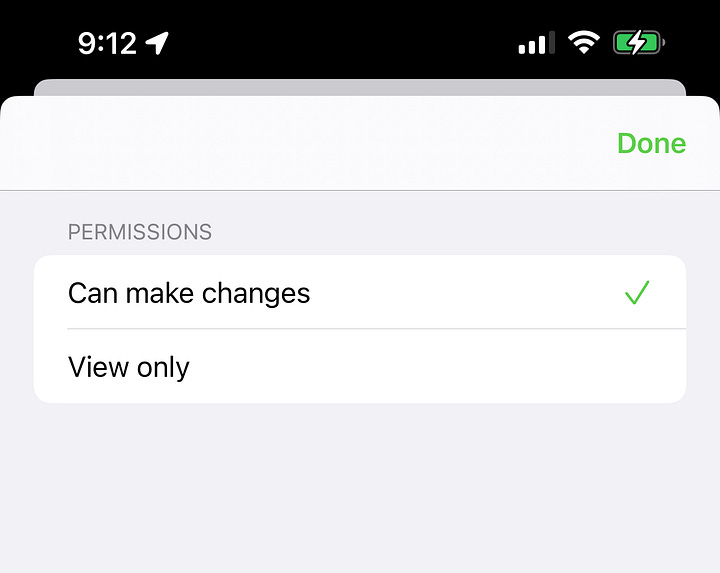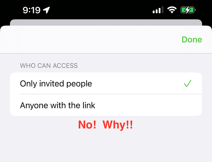 As mentioned in my goals, I wanted to remove the public option, which is possible via the API’s. Using the UICloudSharingController, this is done via the slightly awkward `availablePermissions` field, which combines all of these options into a single array: