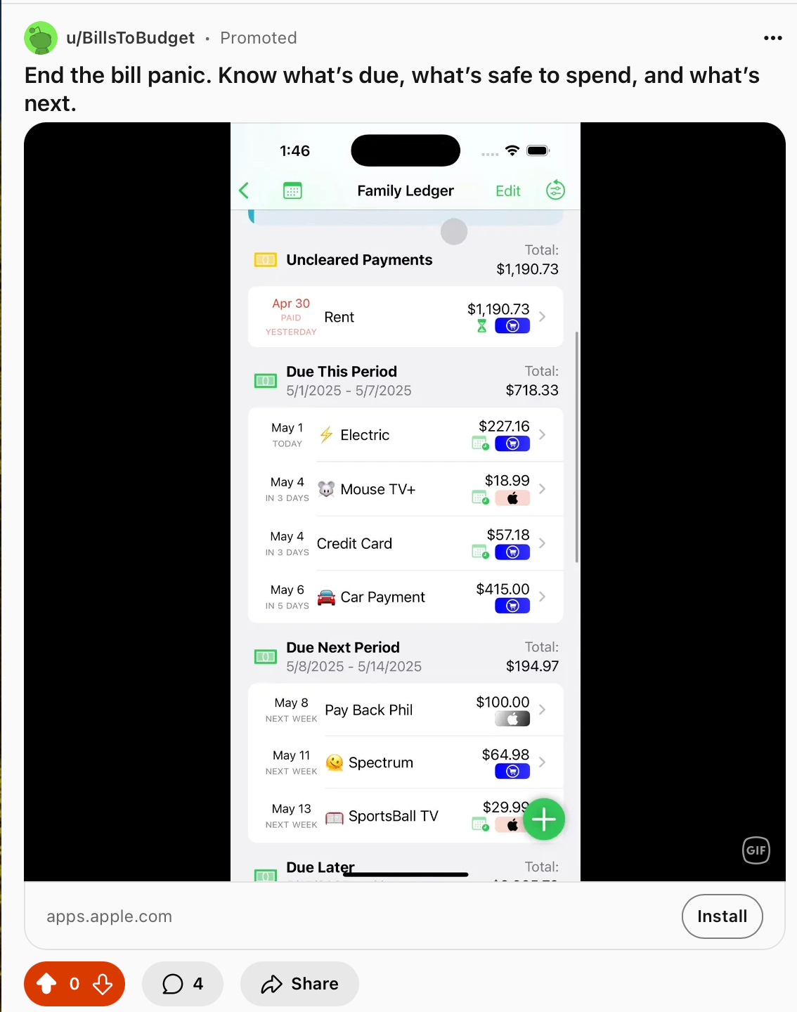 I took the $10/day I was already spending on Apple and redirected it to Reddit. I created a u/BillsToBudget account, wrote some simple ad copy: